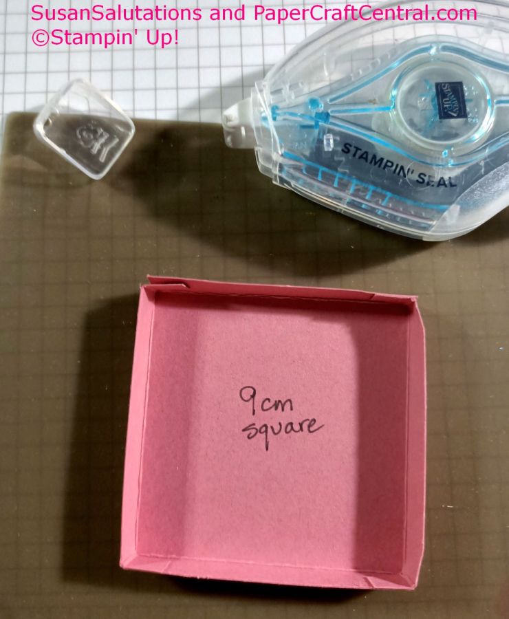 For the body of the box, you will need a square piece of cardstock that measures 9cm x 9cm (or 3 1/2" square)