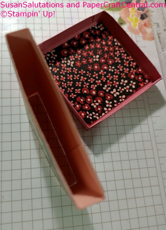Score on all sides at 1cm (3/8") Cut tabs along the score lines. I always take a little notch out of the tabs themselves as it makes the box fit together better. Fold along all score lines. Adhere tabs to inside of box with strong adhesive such as Stampin' Seal. Add a piece of 6.5cm (2 9/16ths") square designer series paper to the inside of the box Add chickens and sentiments as desired