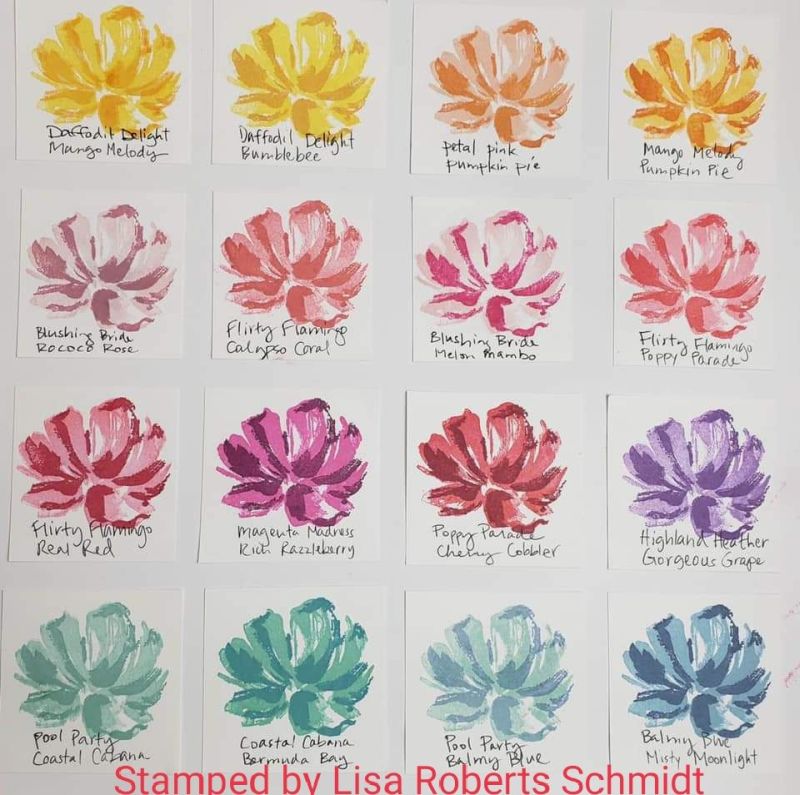 Colour CombinationsA little freebie I can share with you is this ink colour chart for stamping out two step flowers with the Art Gallery stamp set.Thank you to Stampin' Up! Demonstrator Lisa Robert Schmidt for permission to share her experiments! I hope it gives you ideas for how to use your ink colours to stamp flowers and other images.