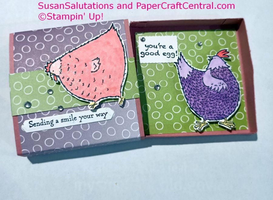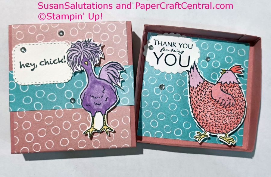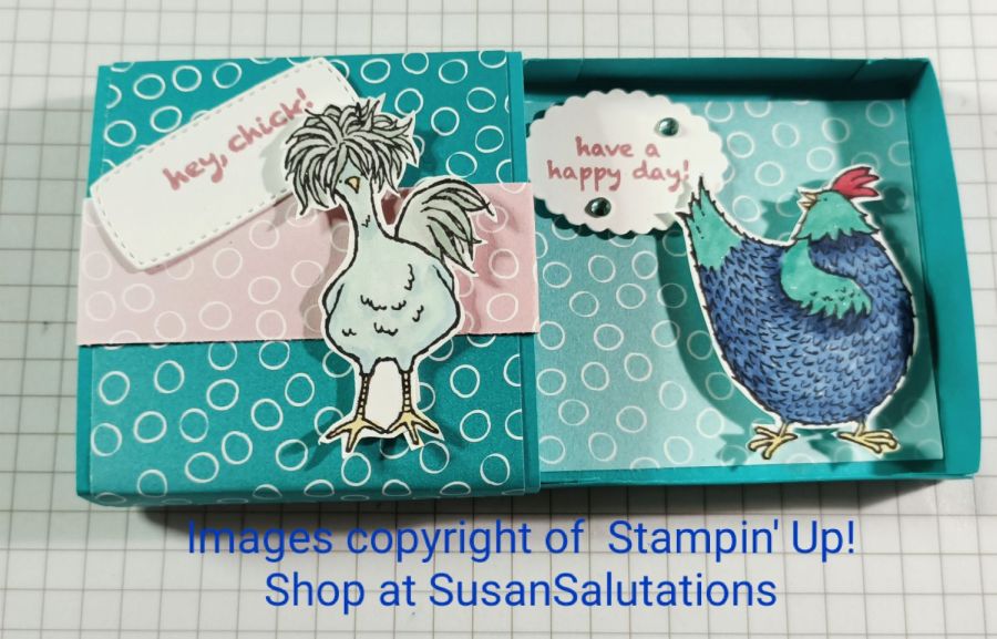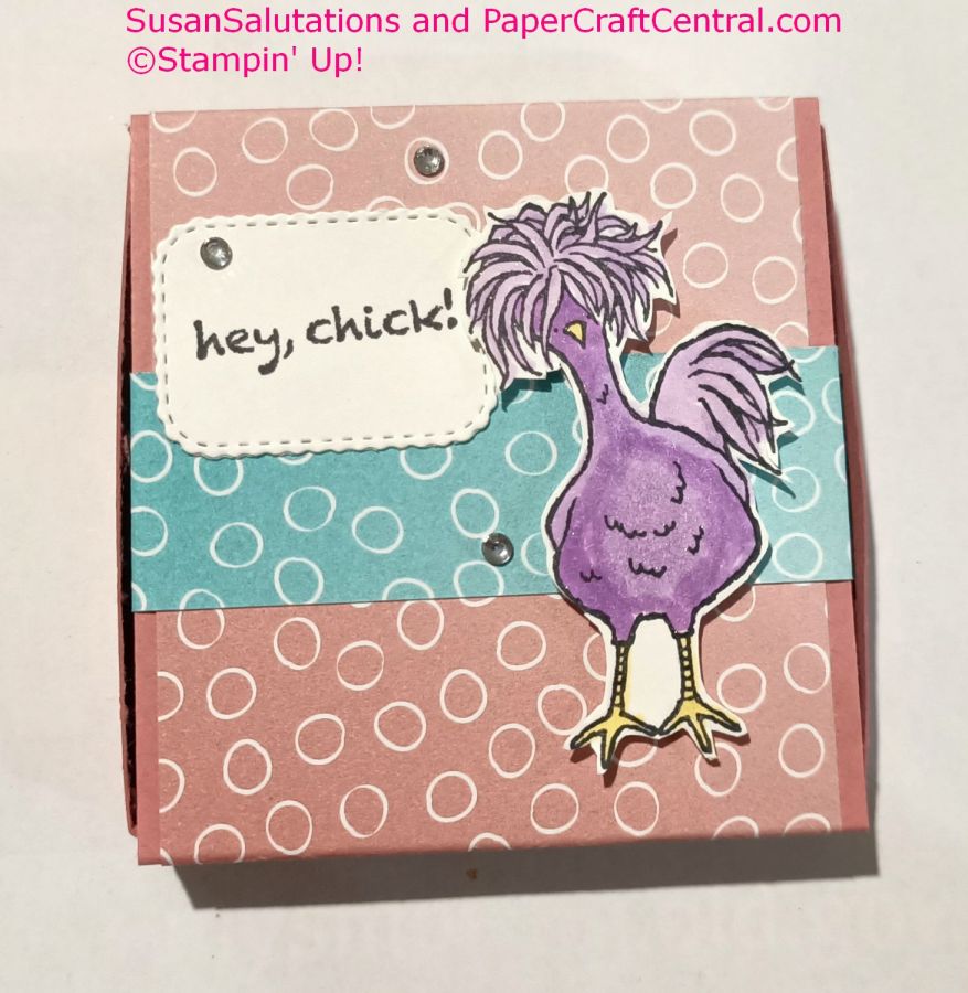 Hey Chick Box GreetingThe Hey Chick Stamp Set is back! I loved it a few years ago and I love it again this year.This stamp set inspired me to make little matchboxes or slide open boxes and create special greetings for some good friends. Maybe you have someone who would be cheered to receive such a greeting. Consider other cute stamps and sentiments you have to recreate a similar project.