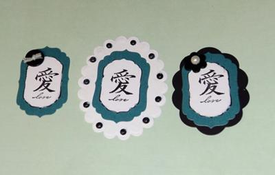 I use ATCs (Artist Trading Cards) for a lot of my Card Toppers, but your challenge sparked the need to try out my Epic Six. I have Label Four Nestabilities by Spellbinders to cut the base shape onto white cardstock (WalMart). I stamped the LOVE symbol from Stampin' Up's Kanji stamp set. I also used the same Nestabilities to cut the next size larger to frame the stamped image, using a discarded teal-colored file folder from work (Recycled). I then played around with different bottom layers, using two different shapes from Nestabilites, although one I didn't use another layer.