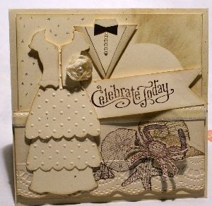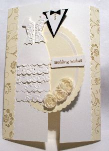 These wedding greeting card 3 projects have embossed elements on them, as you can see. I used the Dress It Up framelets from Stampin' Up! to make the pretty and long dress. The original shape stopped at the first tier of scallops, but I just cut a couple more skirts and lined them up to add length. I cut another top section for the little jacket, split it down the middle and popped it up on the dress top. Then I embossed selected pieces of the dress.