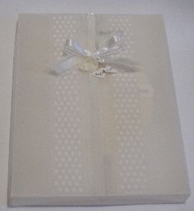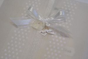 Well, I decided one of the wedding greeting card 3 projects was too 3-d to be placed in an envelope. It needed its own box! So I made one from vellum cardstock and embossed a couple of strips of vellum to add to the box top. I used my favourite white ribbon to tie a bow, then added some more roses and a few punched hearts with the names of the bride and groom tied on. Cutest effect ever! Lol!