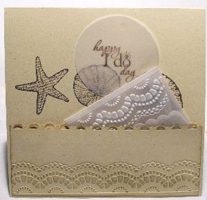 The wedding was a wishing well wedding so my gift was going to be monetary. This time I made a scallop edged envelope out of vellum cardstock and slipped it into a little pocket of cardstock inside the card, so I could place my gift into it in safety. Then I stamped my Word Play sentiment onto vellum and added it over the shells I stamped directly to paper. I wrote my greeting on the strip of plain cardstock on the pocket later: